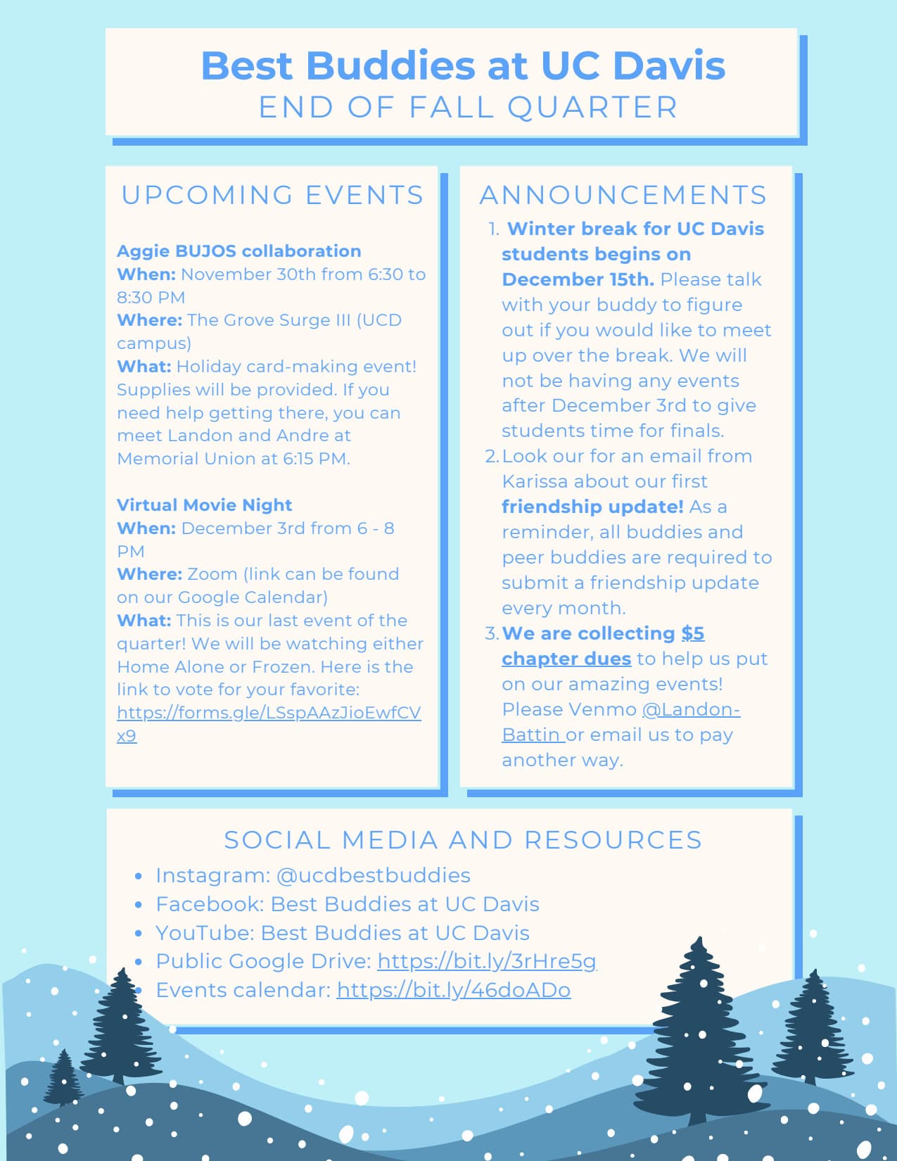 We will send out newsletters every month from September to June. There you can find announcements, upcoming chapter events, community events, and ideas for things to do with your buddy.